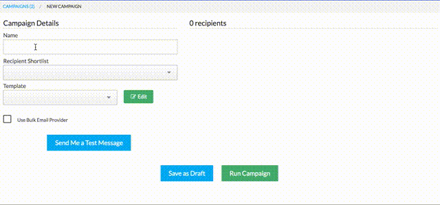 To create a campaign, you first need a shortlist of recipients (more on that here), and secondly you need an email template to send to all of your recipients (more on that here) – note that if you want to track link clicks or opens, this must be set on the template.