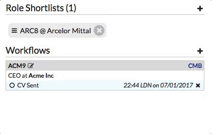 If you haven’t shortlisted a candidate for a role previously (or your administrator has removed the shortlisting function), you can just create a workflow directly: click the + icon next to the workflows section title, and in the box provided you can search for a role by any of the: Role Identifier, Client Name, Role Title or Hiring Manager Name: once you’ve found the right role, click the Add button: