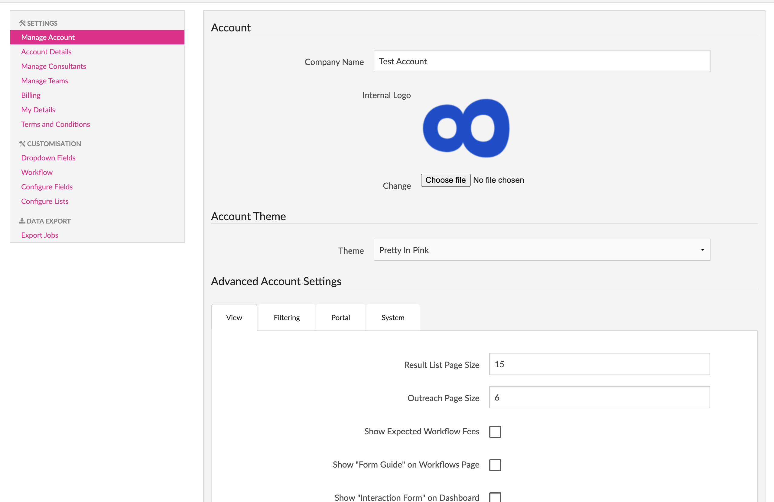 To configure your account go to the “Settings” screen and from the left sidebar click the “Manage Account” item to take your to the “Account” screen, which will allow you to configure various settings regarding the overall company account.